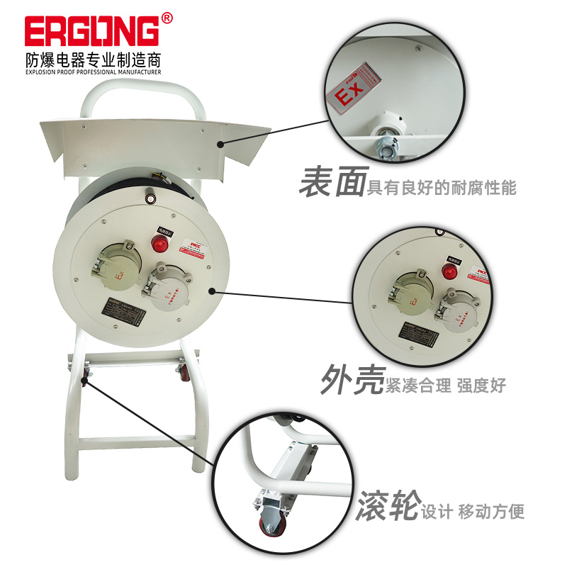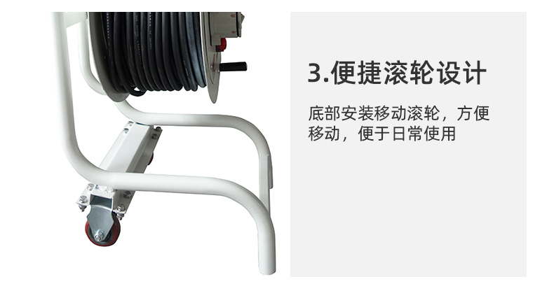 6.電纜盤轉動靈活,移動時有托架及行走輪,移動方便。7.電纜長度標準配置為30米,可根據用戶要求加長