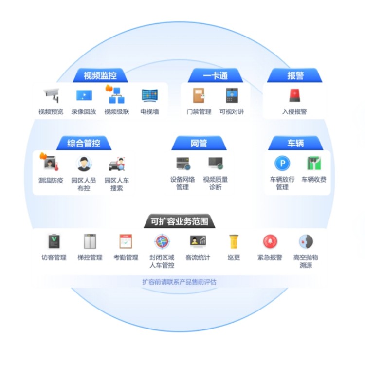 整合視頻監(jiān)控、視頻聯(lián)網(wǎng)、門禁管理、可視對講管理、入侵報警、停車繳費、事件聯(lián)動、運維管理等子系統(tǒng)