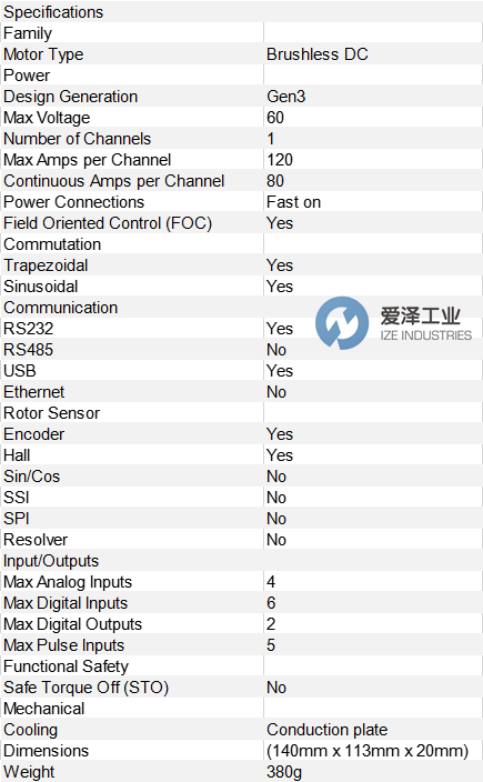 無刷直流電機控制器,單通道,1 x 120A,60V,USB,CAN,梯形波/正弦波,FOC,8個數字/模擬輸入輸出,帶ABS蓋的冷卻板