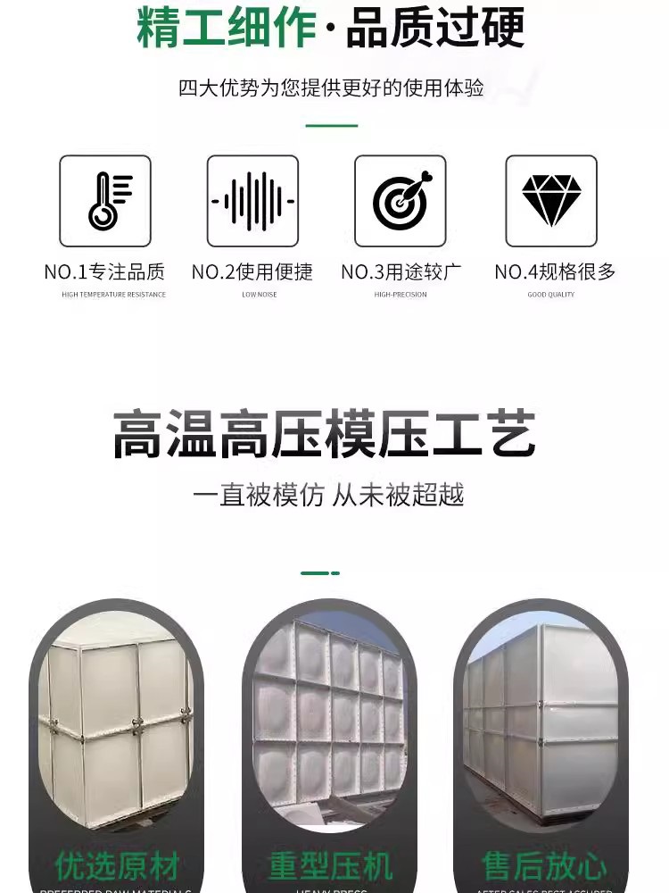 信陽羅山縣地埋箱泵一體化消防泵站 預制混凝土裝配式SW水箱在制造工藝上,采取機壓成型的制作方法。增加了抗振、抗沖擊的強度,克服了手糊制品強度不均勻的缺陷,增加了耐壓強度和使用壽命;在外型設計上,板塊中部呈凹陷弧度,增加了水箱的承壓能力。地埋式箱泵一體化消防泵站以螺栓連接,既沒有了現場焊接的繁瑣,又以免焊接發生的腐蝕,不銹鋼螺栓的食用硅膠密封墊,使成型后的水箱不滲、不跑冒。可以組合大小任意性。